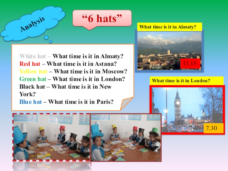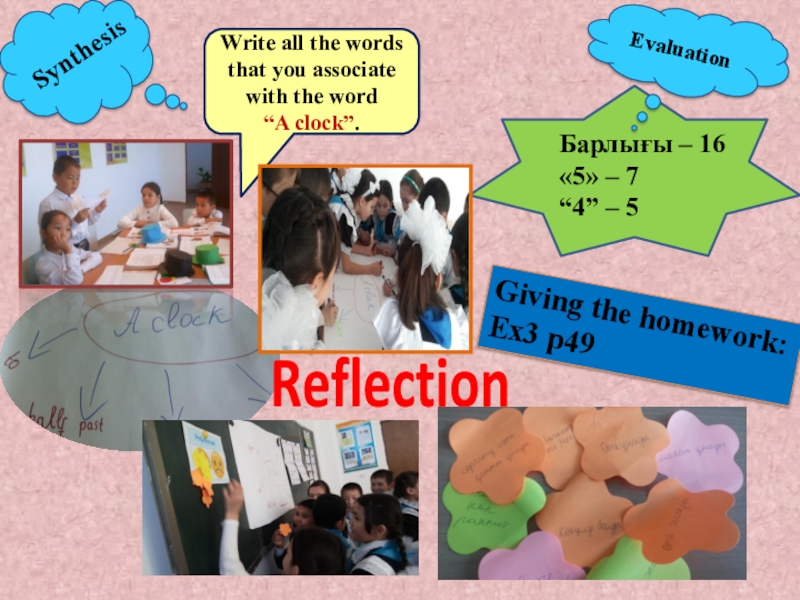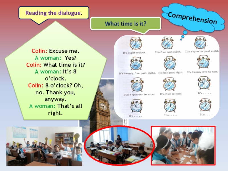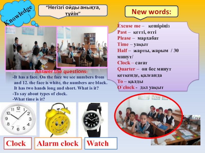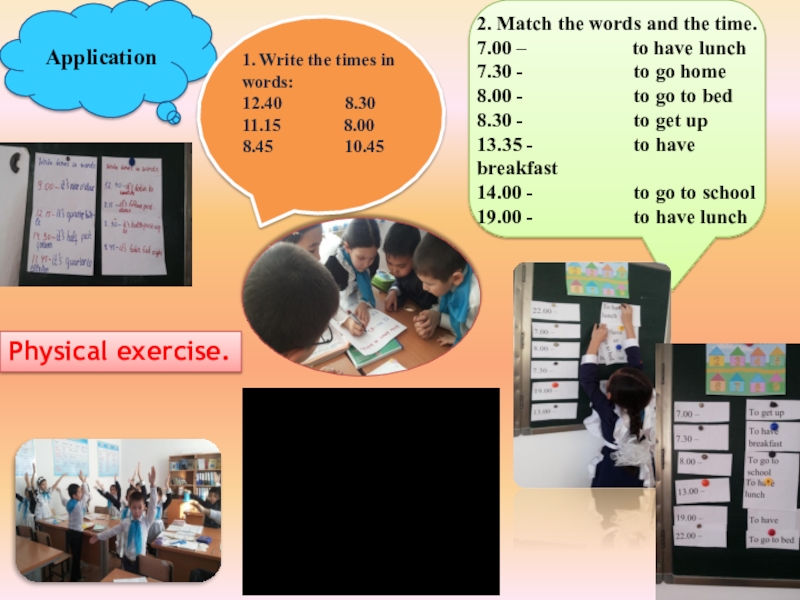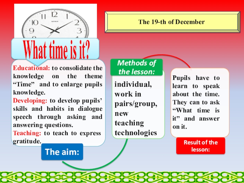 Pupils have to learn to speak about the time. They can to ask “What time is it” and answer on it.
