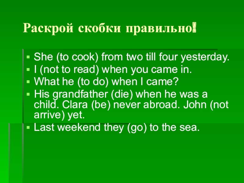 Раскрой скобки правильно!She (to cook) from two till four yesterday.I (not to read) when you came in.What he (to do) when I came?His grandfather (die) when he was a child. Clara (be) never abroad. John (not