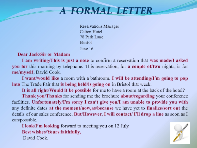 I am writing/This is just a note to confirm a reservation that was made/I asked you for this morning by telephone. This reservation, for a couple of/two nights, is for me/myself, David Cook.