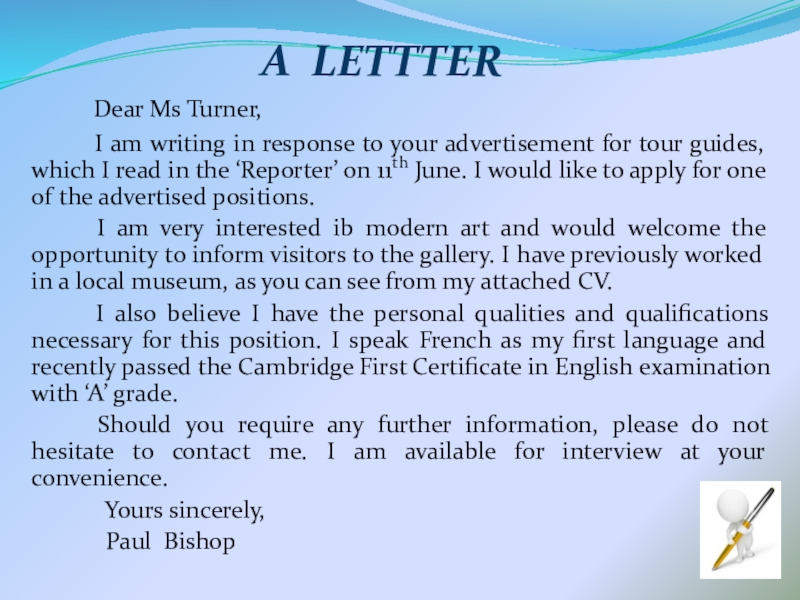I am writing in response to your advertisement for tour guides, which I read in the ‘Reporter’ on 11th June. I would like to apply for one of the advertised positions.