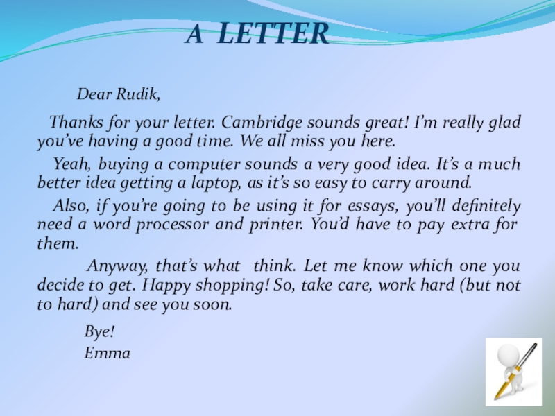 Thanks for your letter. Cambridge sounds great! I’m really glad you’ve having a good time. We all miss you here.