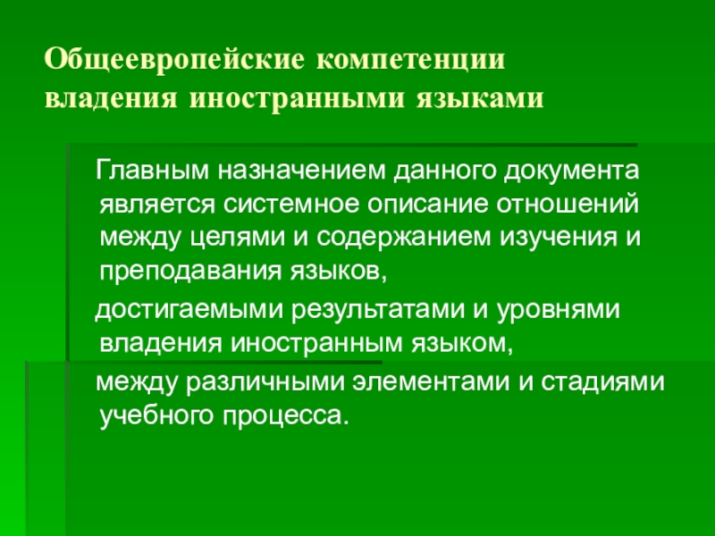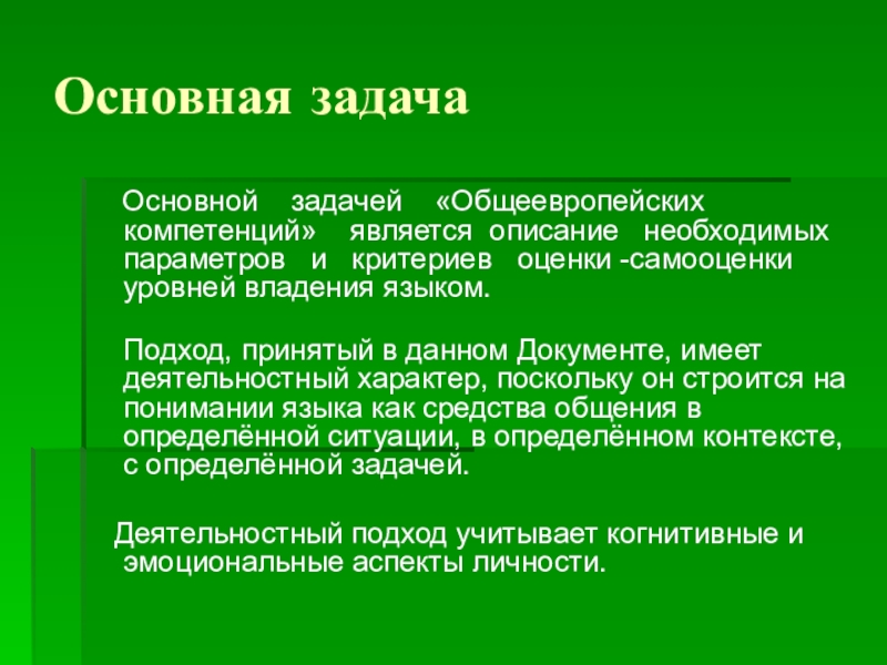 Подход, принятый в данном Документе, имеет деятельностный характер, поскольку он строится на понимании языка как средства общения в определённой ситуации, в определённом контексте, с определённой задачей.