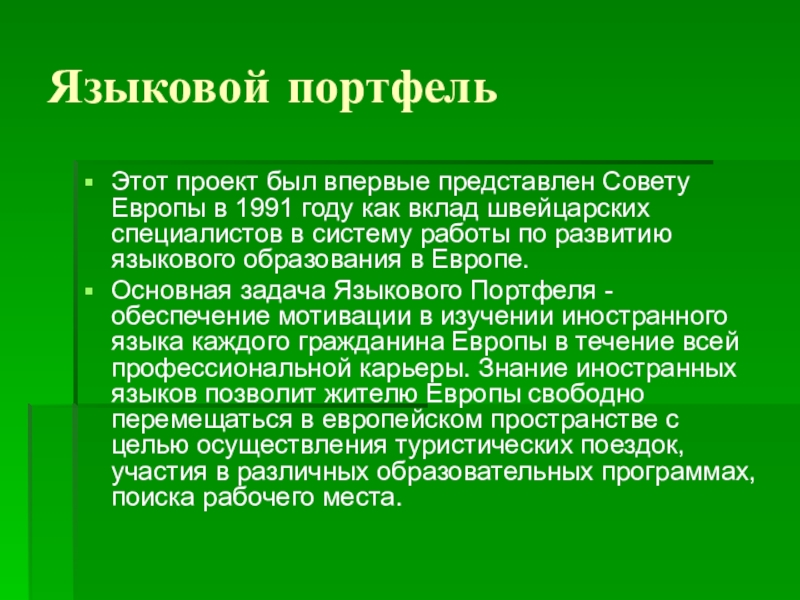 Основная задача Языкового Портфеля - обеспечение мотивации в изучении иностранного языка каждого гражданина Европы в течение всей профессиональной карьеры. Знание иностранных языков позволит жителю Европы свободно перемещаться в европейском пространстве с целью осуществления туристических поездок, участия в различных образовательных программах, поиска рабочего места.