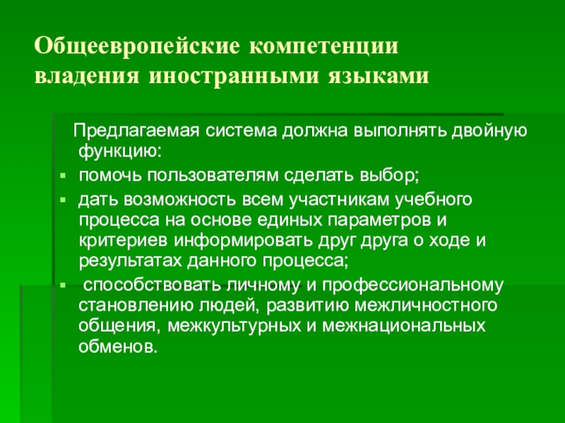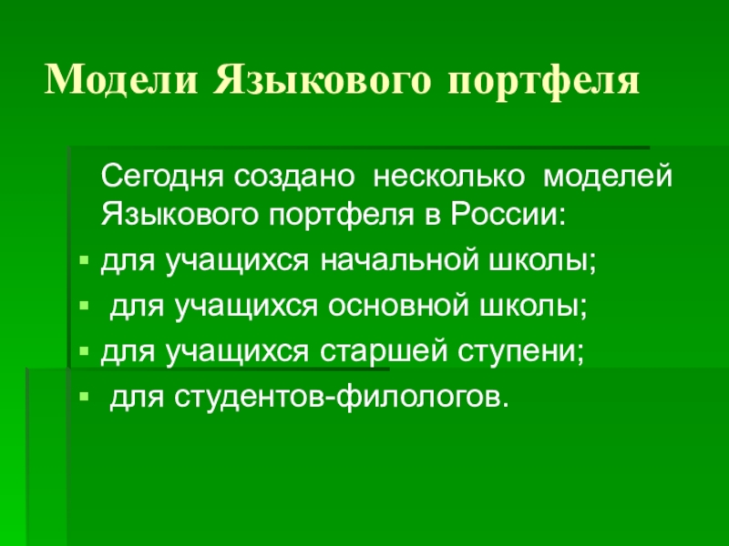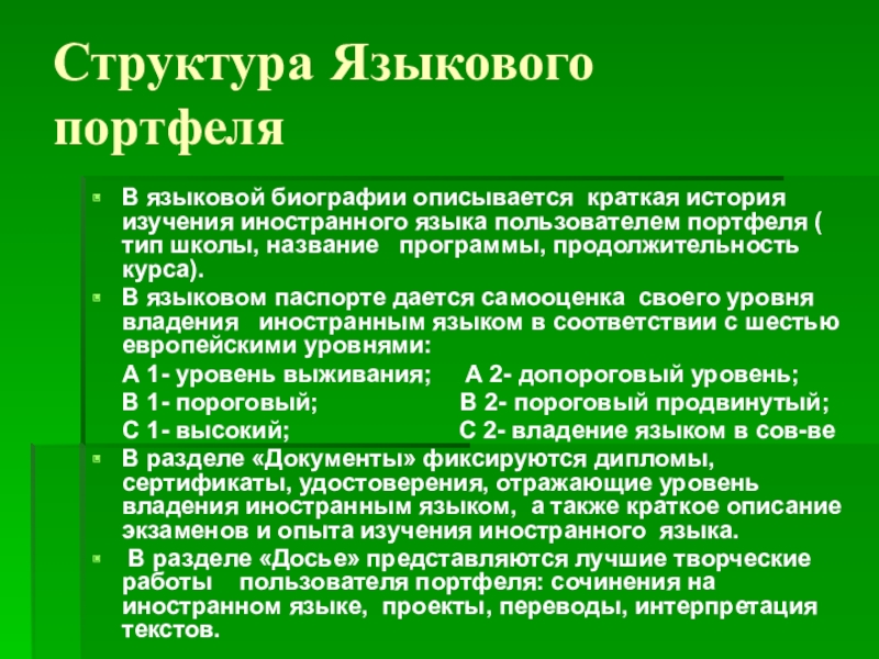 Языковой Портфель служит фундаментом для создания материалов для самооценки с учётом европейских уровней владения языком, даёт ориентацию для авторов учебных программ и учебно-методических комплексов.