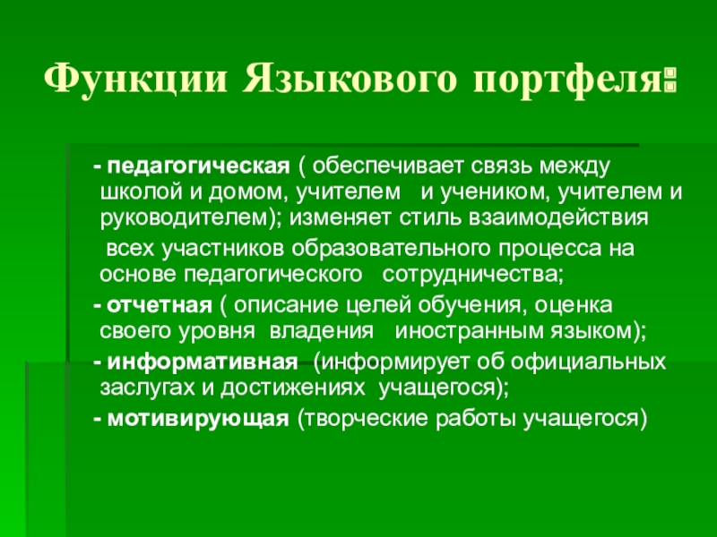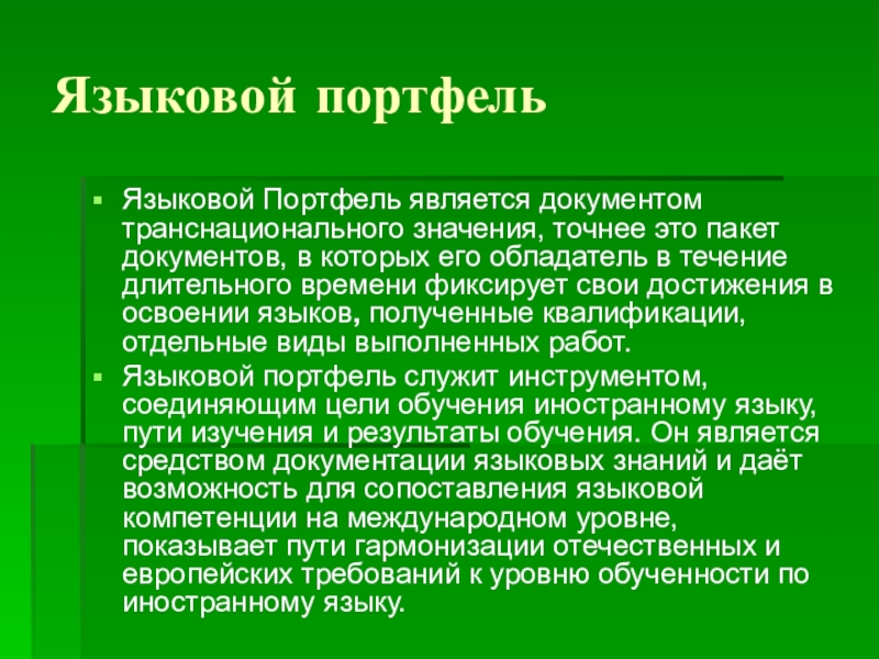 Языковой портфель служит инструментом, соединяющим цели обучения иностранному языку, пути изучения и результаты обучения. Он является средством документации языковых знаний и даёт возможность для сопоставления языковой компетенции на международном уровне, показывает пути гармонизации отечественных и европейских требований к уровню обученности по иностранному языку.