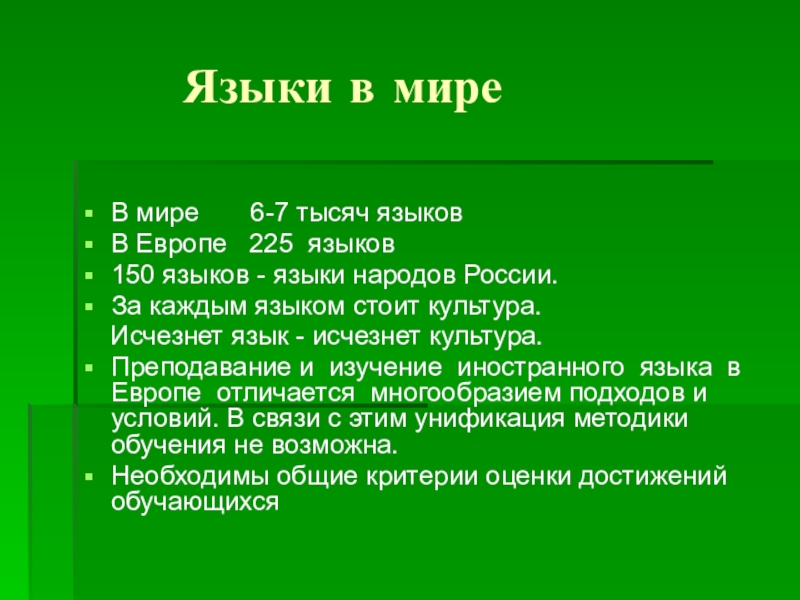 Преподавание и изучение иностранного языка в Европе отличается многообразием подходов и условий. В связи с этим унификация методики обучения не возможна.