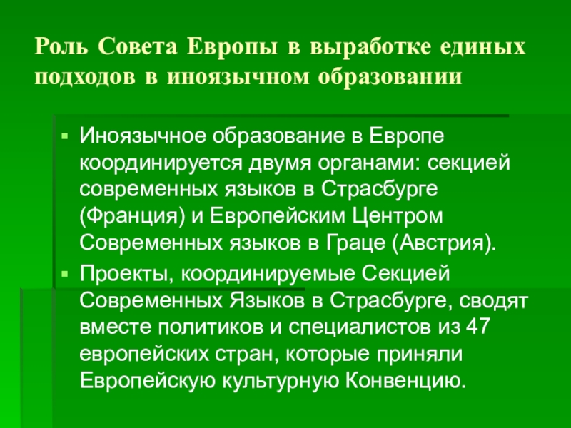 Слайд 4Роль Совета Европы в выработке единых подходов в иноязычном образовании