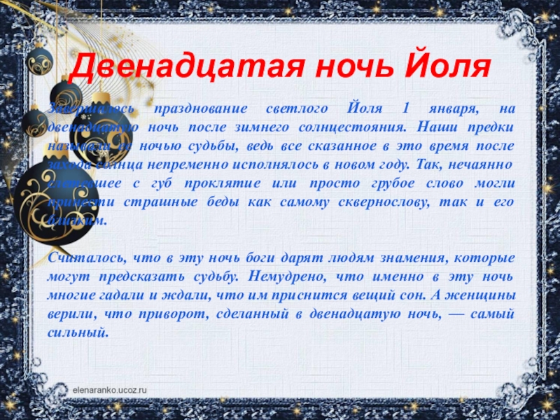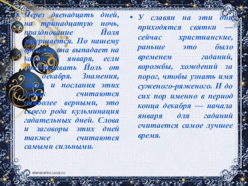 Слайд 22Через двенадцать дней, на тринадцатую ночь, празднование Йоля завершается. По нашему