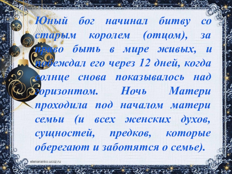 в мире живых, и побеждал его через 12 дней, когда солнце снова показывалось над горизонтом. Ночь Матери проходила под началом матери семьи (и всех женских духов, сущностей, предков, которые оберегают и заботятся о семье).
