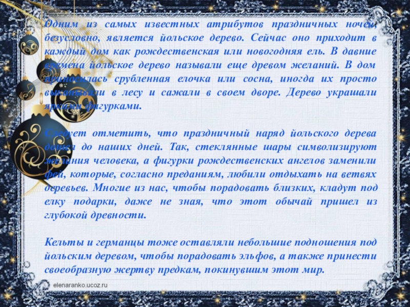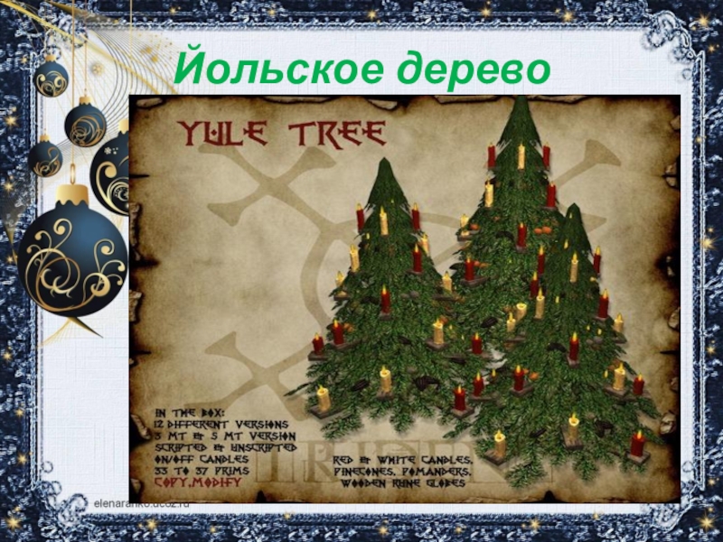 Слайд 31Одним из самых известных атрибутов праздничных ночей, безусловно, является йольское дерево.