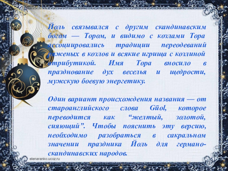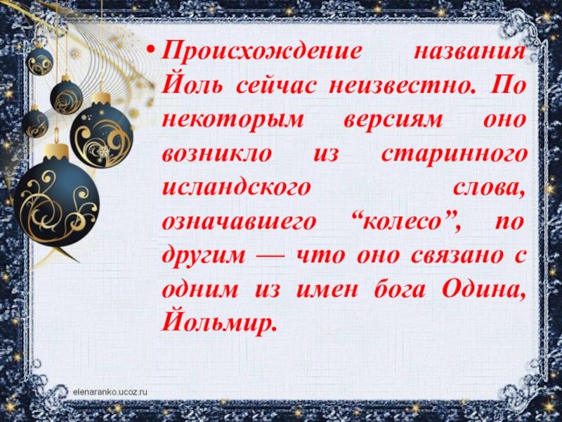 Слайд 7Происхождение названия Йоль сейчас неизвестно. По некоторым версиям оно возникло из