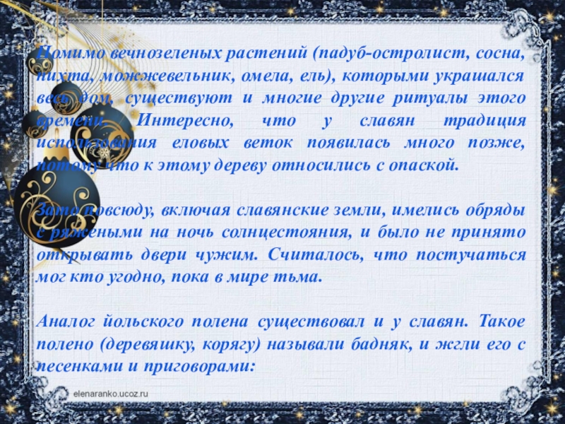 весь дом, существуют и многие другие ритуалы этого времени. Интересно, что у славян традиция использования еловых веток появилась много позже, потому что к этому дереву относились с опаской.