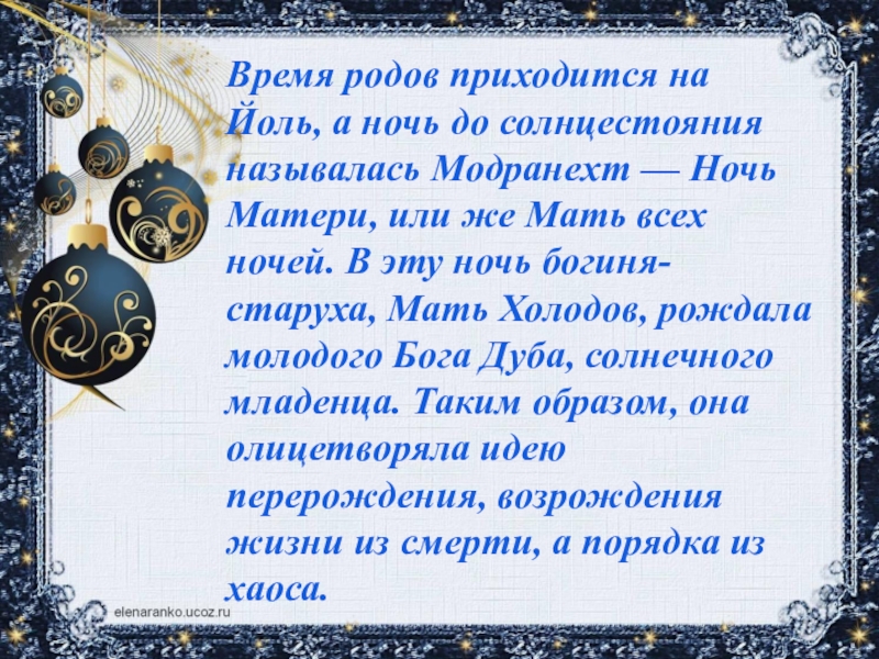 Слайд 17Время родов приходится на Йоль, а ночь до солнцестояния называлась Модранехт