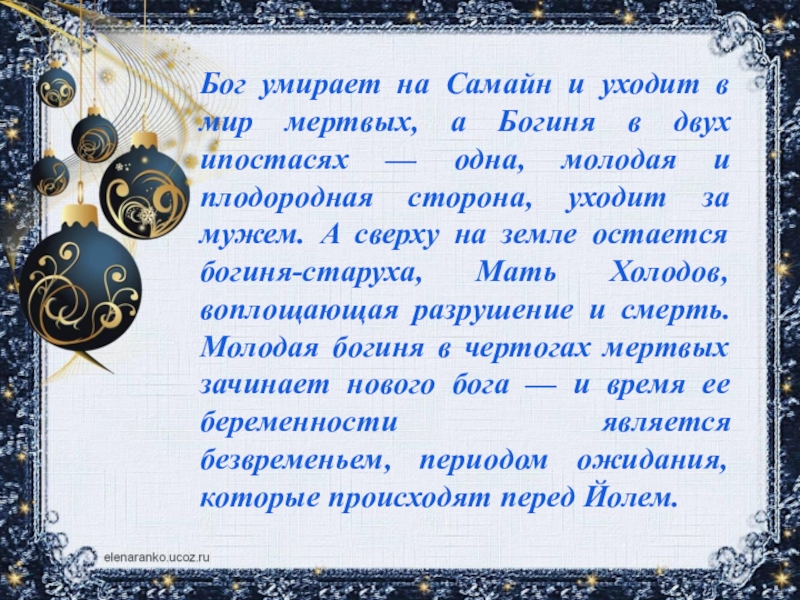 Слайд 15Бог умирает на Самайн и уходит в мир мертвых, а Богиня