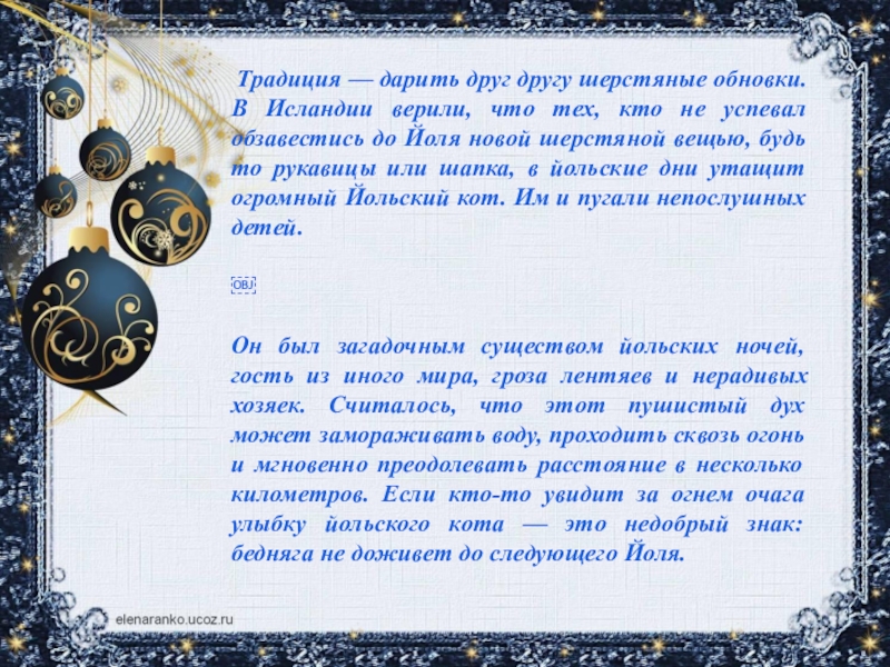 Слайд 40 Традиция — дарить друг другу шерстяные обновки. В Исландии верили,
