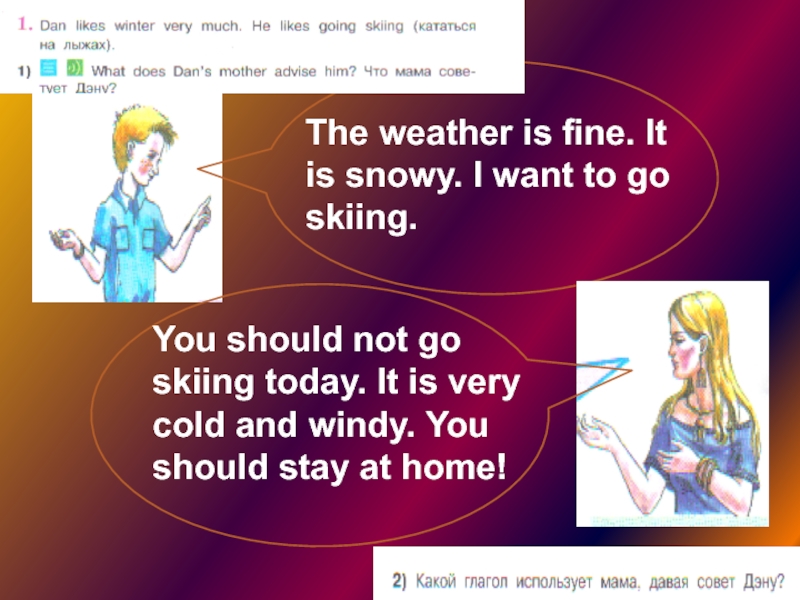 You should not go skiing today. It is very cold and windy. You should stay at home!