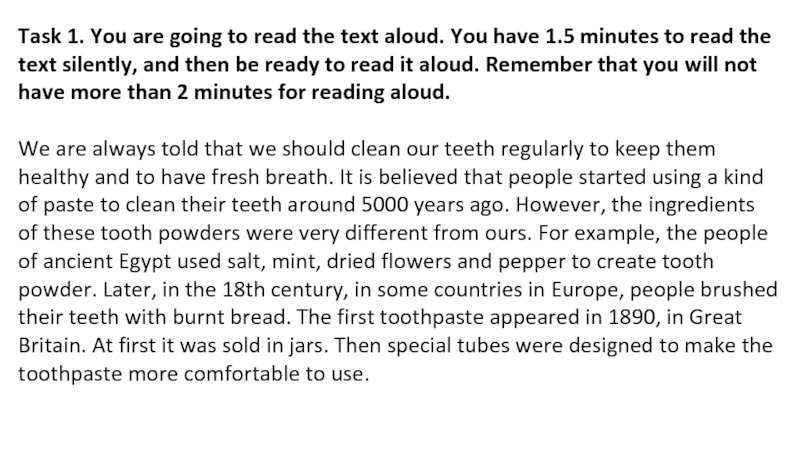 have 1.5 minutes to read the text silently, and then be ready to read it aloud. Remember that you will not have more than 2 minutes for reading aloud.
