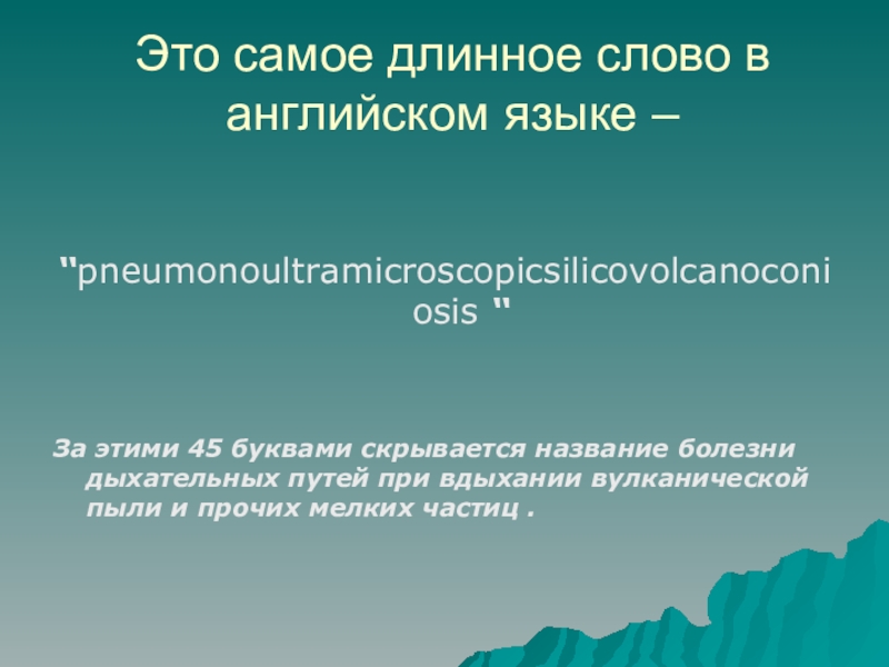 Это самое длинное слово в английском языке – “pneumonoultramicroscopicsilicovolcanoconiosis “За этими 45 буквами скрывается название болезни дыхательных