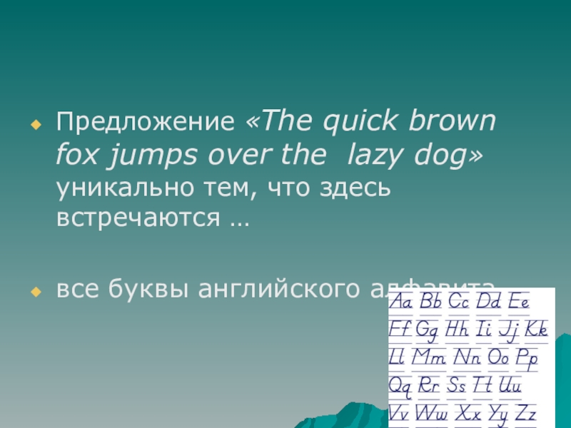 Слайд 11Предложение «The quick brown fox jumps over the  lazy dog» уникально