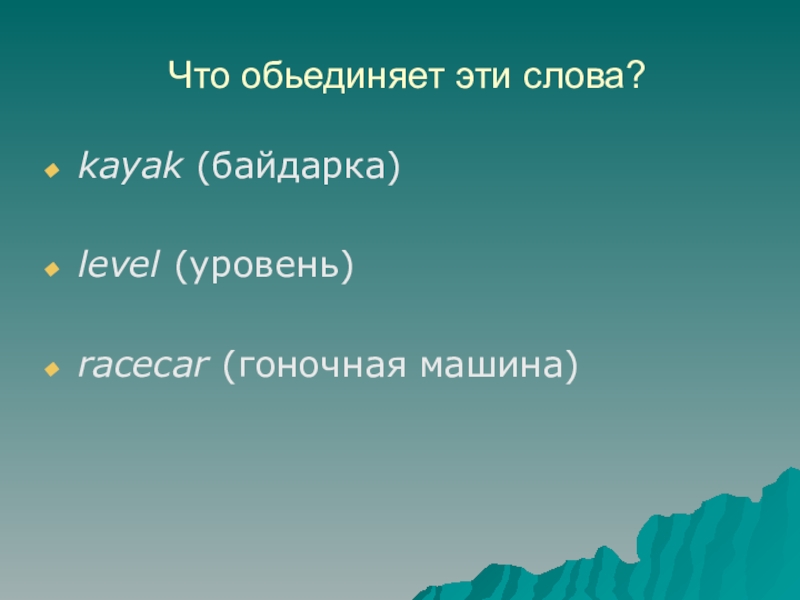 Что обьединяет эти слова?kayak (байдарка)level (уровень) racecar (гоночная машина)