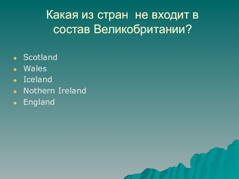Какая из стран не входит в состав Великобритании? ScotlandWalesIcelandNothern IrelandEngland
