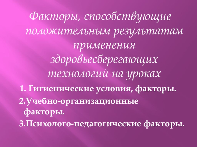 Слайд 8Факторы, способствующие положительным результатам применения здоровьесберегающих технологий на уроках