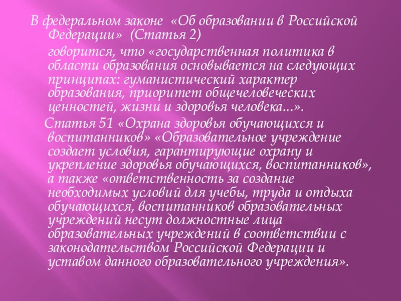 Статья 51 «Охрана здоровья обучающихся и воспитанников» «Образовательное учреждение создает условия, гарантирующие охрану и укрепление здоровья обучающихся, воспитанников», а также «ответственность за создание необходимых условий для учебы, труда и отдыха обучающихся, воспитанников образовательных учреждений несут должностные лица образовательных учреждений в соответствии с законодательством Российской Федерации и уставом данного образовательного учреждения».
