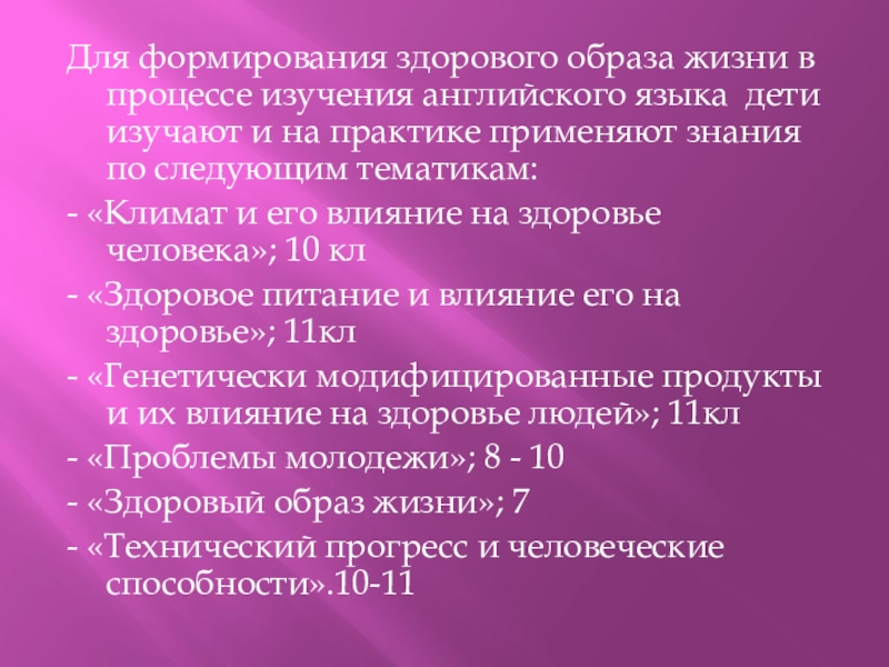 Слайд 16Для формирования здорового образа жизни в процессе изучения английского языка дети