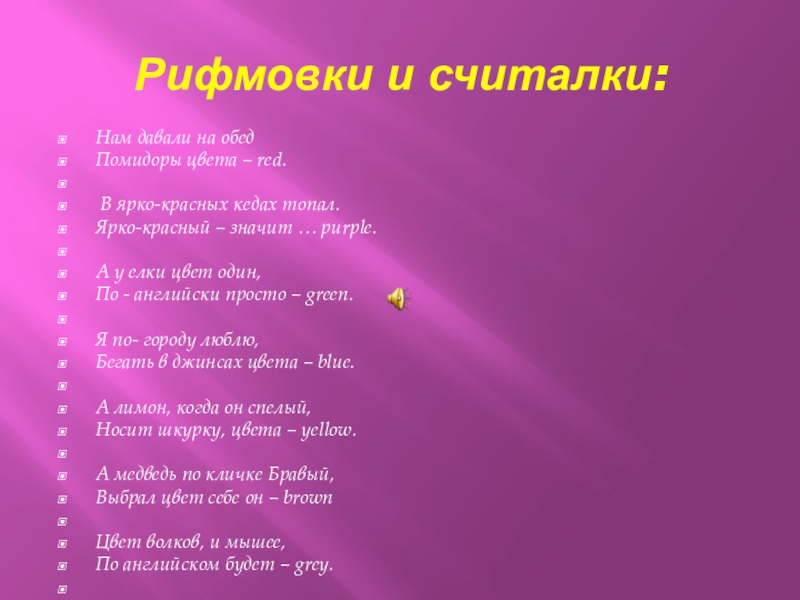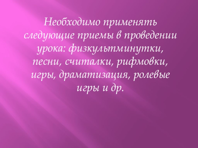 Слайд 9Необходимо применять следующие приемы в проведении урока: физкультминутки, песни, считалки, рифмовки,