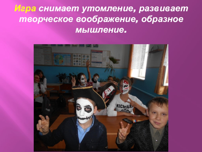Слайд 10Игра снимает утомление, развивает творческое воображение, образное мышление.