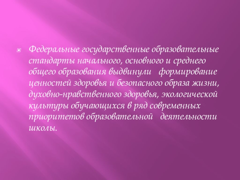 формирование ценностей здоровья и безопасного образа жизни, духовно-нравственного здоровья, экологической культуры обучающихся в ряд современных приоритетов образовательной деятельности школы.