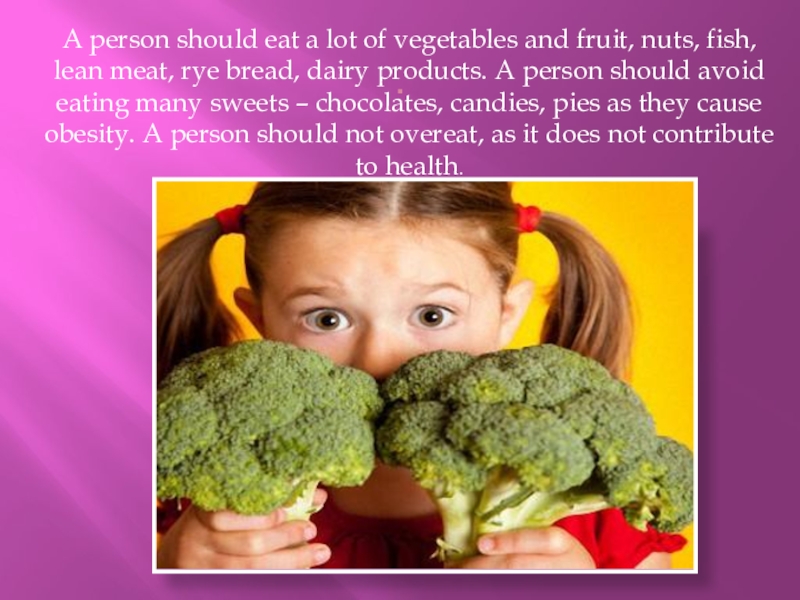 fish, lean meat, rye bread, dairy products. A person should avoid eating many sweets – chocolates, candies, pies as they cause obesity. A person should not overeat, as it does not contribute to health.