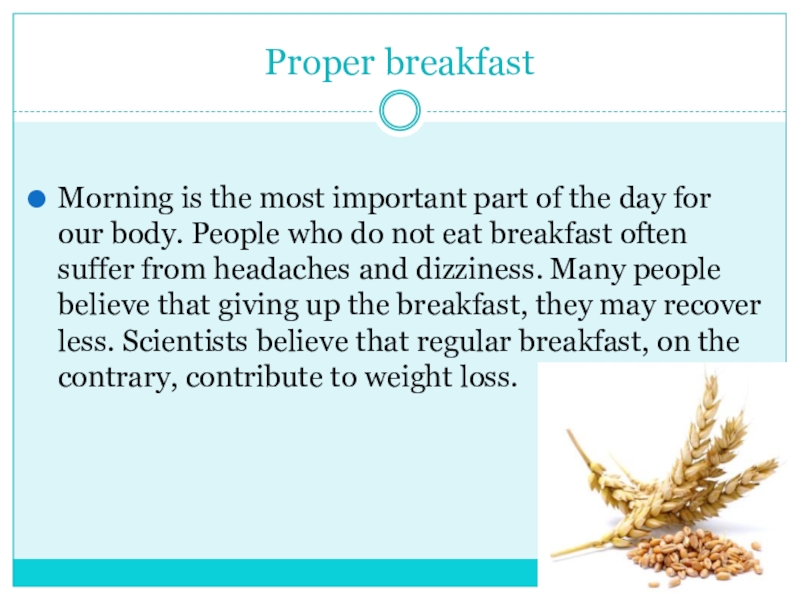 our body. People who do not eat breakfast often suffer from headaches and dizziness. Many people believe that giving up the breakfast, they may recover less. Scientists believe that regular breakfast, on the contrary, contribute to weight loss.