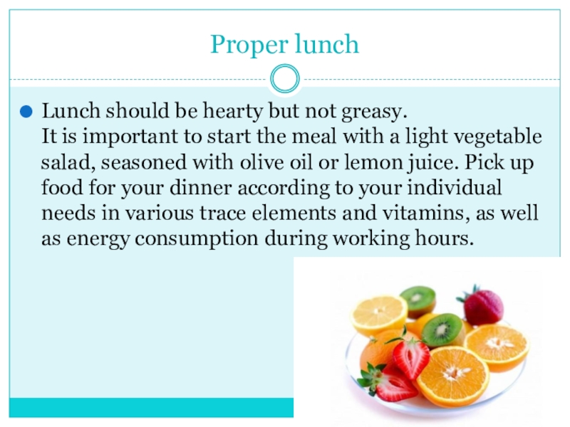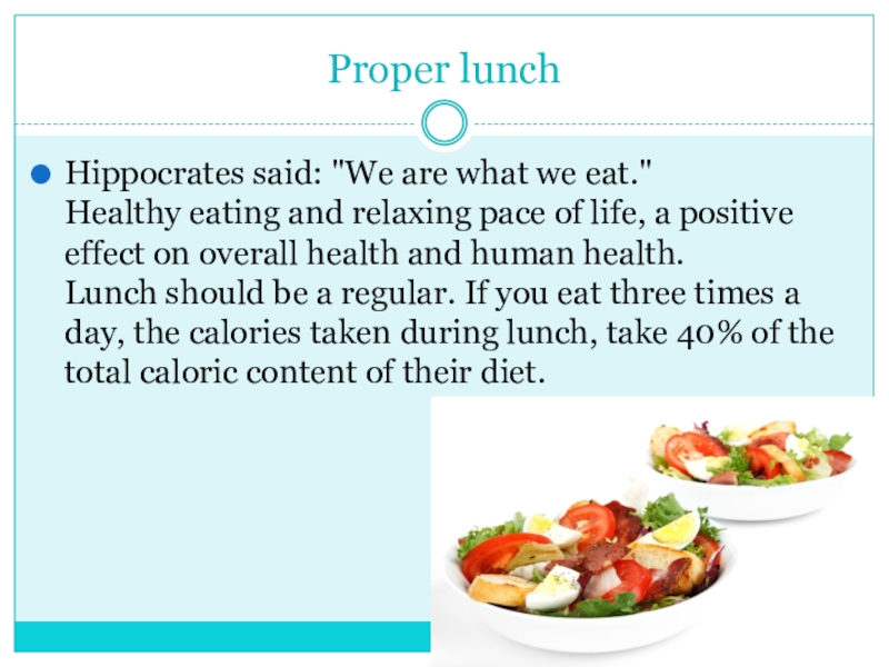Lunch should be a regular. If you eat three times a day, the calories taken during lunch, take 40% of the total caloric content of their diet.