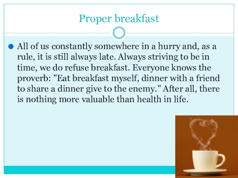a rule, it is still always late. Always striving to be in time, we do refuse breakfast. Everyone knows the proverb: "Eat breakfast myself, dinner with a friend to share a dinner give to the enemy." After all, there is nothing more valuable than health in life.