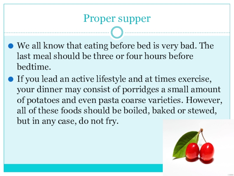 If you lead an active lifestyle and at times exercise, your dinner may consist of porridges a small amount of potatoes and even pasta coarse varieties. However, all of these foods should be boiled, baked or stewed, but in any case, do not fry.