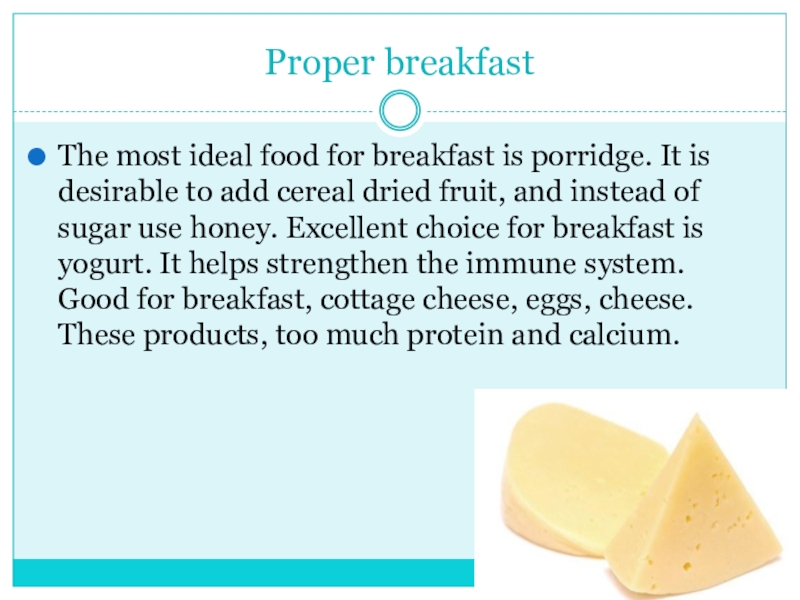 desirable to add cereal dried fruit, and instead of sugar use honey. Excellent choice for breakfast is yogurt. It helps strengthen the immune system. Good for breakfast, cottage cheese, eggs, cheese. These products, too much protein and calcium.