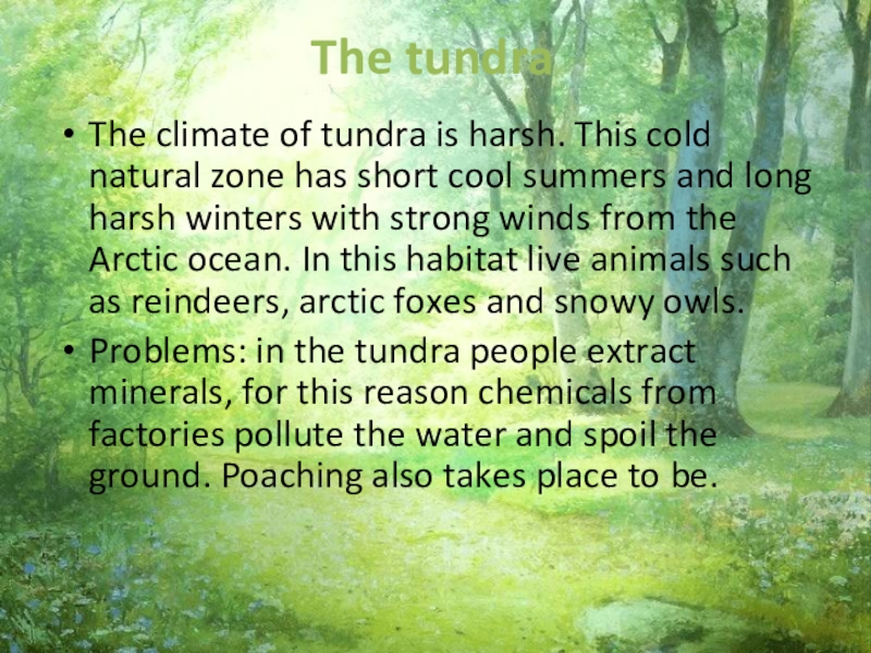 The tundraThe climate of tundra is harsh. This cold natural zone has short cool summers and long harsh winters with strong winds from the Arctic ocean. In this habitat live animals such as reindeers, arctic foxes
