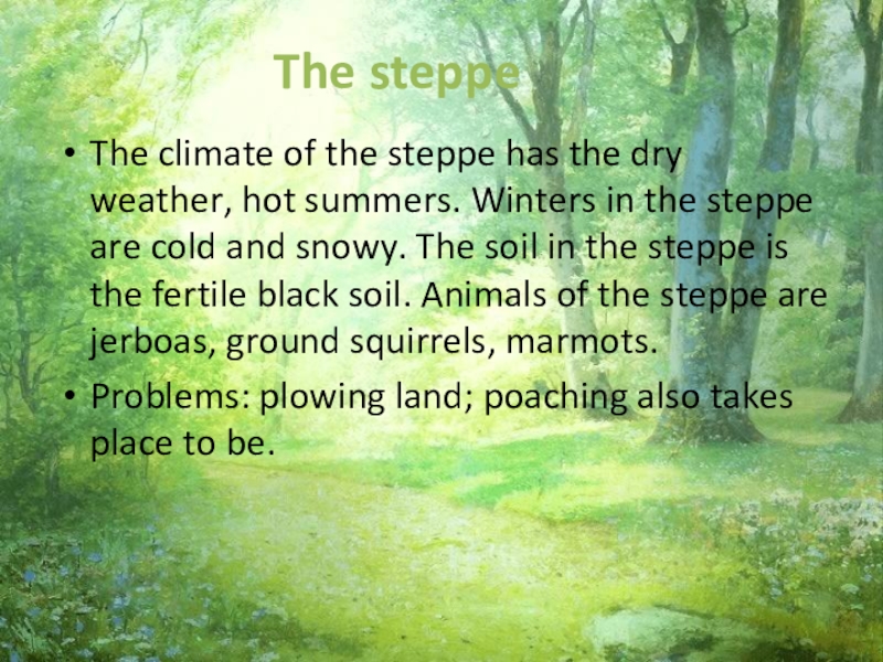 summers. Winters in the steppe are cold and snowy. The soil in the steppe is the fertile black soil. Animals of the steppe are jerboas, ground squirrels, marmots.