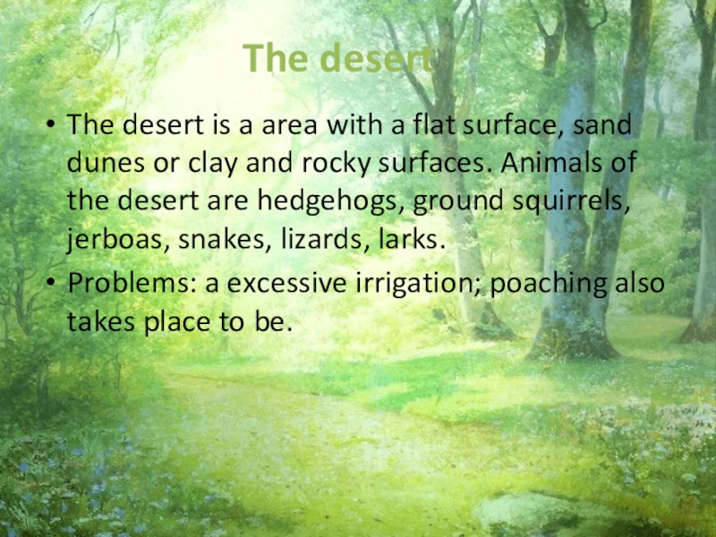 The desertThe desert is a area with a flat surface, sand dunes or clay and rocky surfaces.