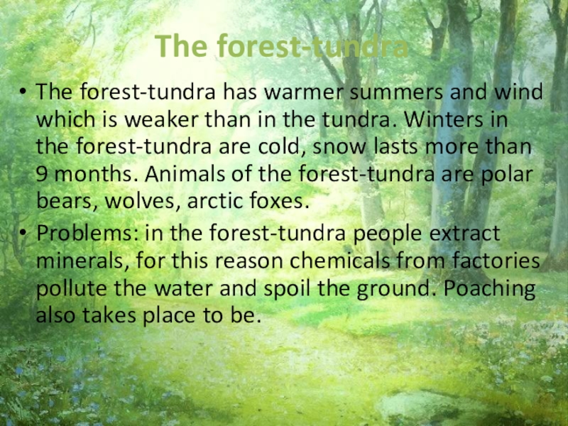 Problems: in the forest-tundra people extract minerals, for this reason chemicals from factories pollute the water and spoil the ground. Poaching also takes place to be.