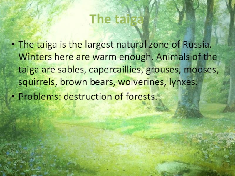 The taigaThe taiga is the largest natural zone of Russia. Winters here are warm enough. Animals of