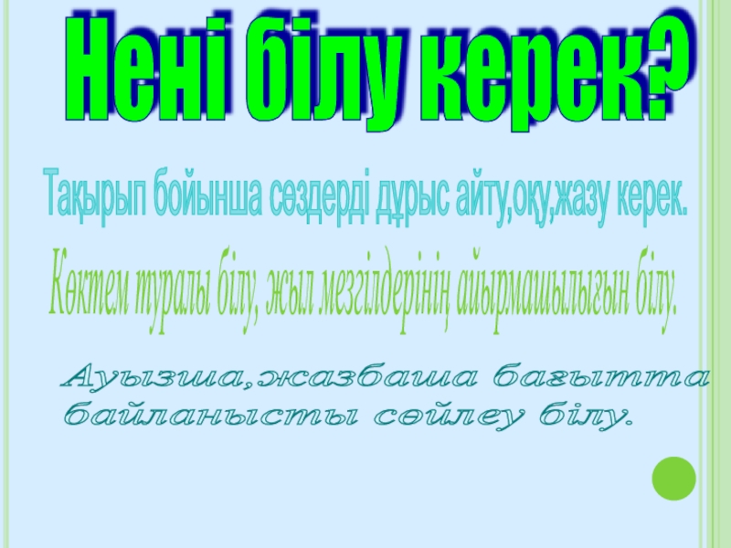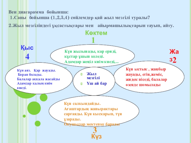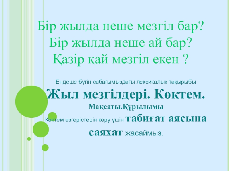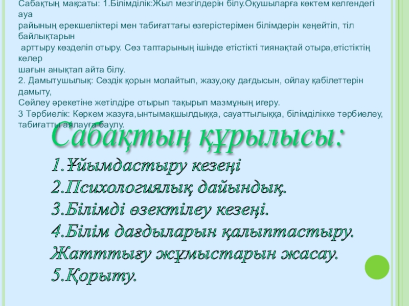 Сабақтың мақсаты: 1.Білімділік:Жыл мезгілдерін білу.Оқушыларға көктем келгендегі ауа