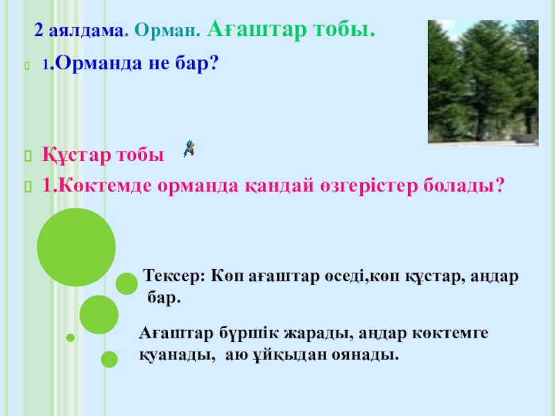 Тексер: Көп ағаштар өседі,көп құстар, аңдар