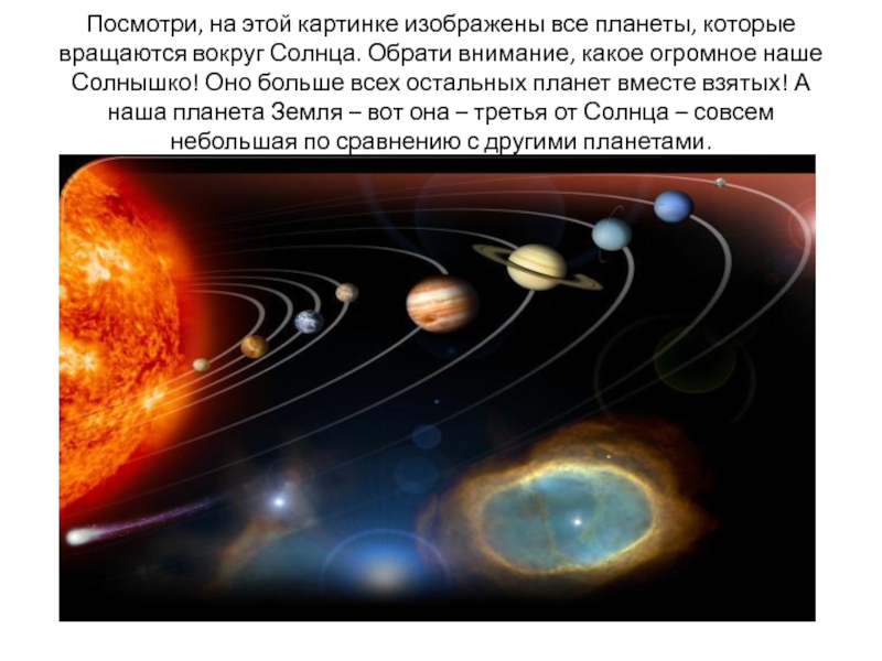 Посмотри, на этой картинке изображены все планеты, которые вращаются вокруг Солнца. Обрати внимание, какое огромное наше Солнышко!