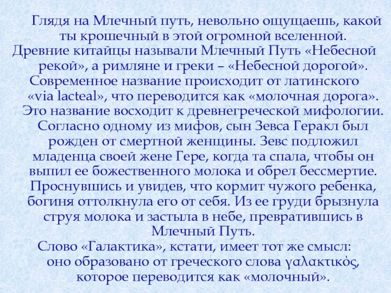 Древние китайцы называли Млечный Путь «Небесной рекой», а римляне и греки – «Небесной дорогой».