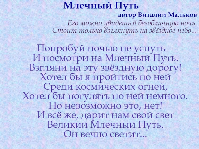 Попробуй ночью не уснуть И посмотри на Млечный Путь. Взгляни на эту звёздную дорогу! Хотел бы я пройтись по ней Среди космических огней, Хотел бы погулять по ней немного. Но невозможно это, нет! И всё же, дарит нам свой свет Великий Млечный Путь. Он вечно светит...