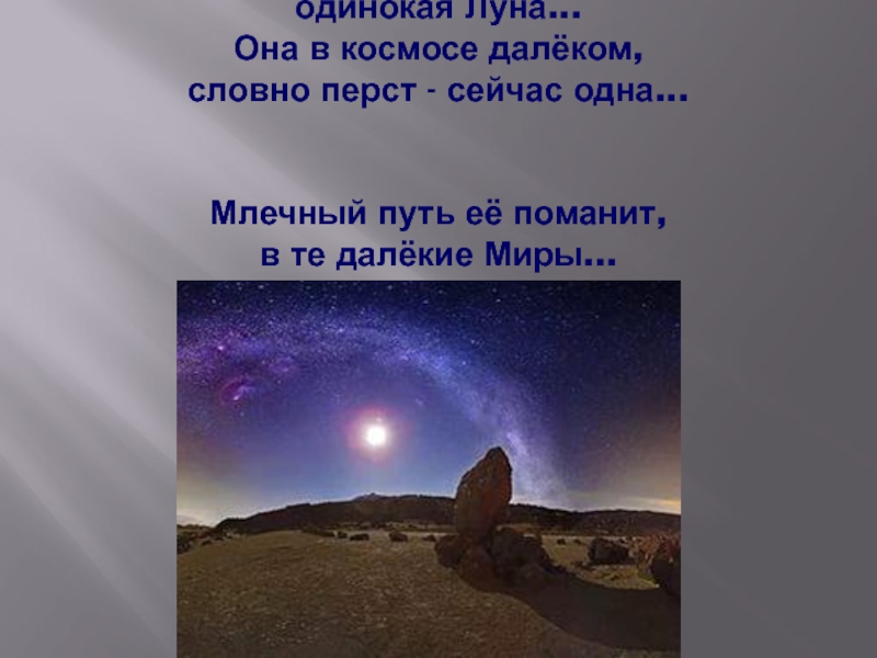 Слайд 30Заскучала в небе тёмном, одинокая Луна... Она в космосе далёком, словно перст - сейчас