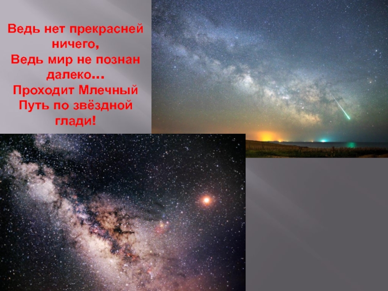 Слайд 34Ведь нет прекрасней ничего, Ведь мир не познан далеко... Проходит Млечный Путь по