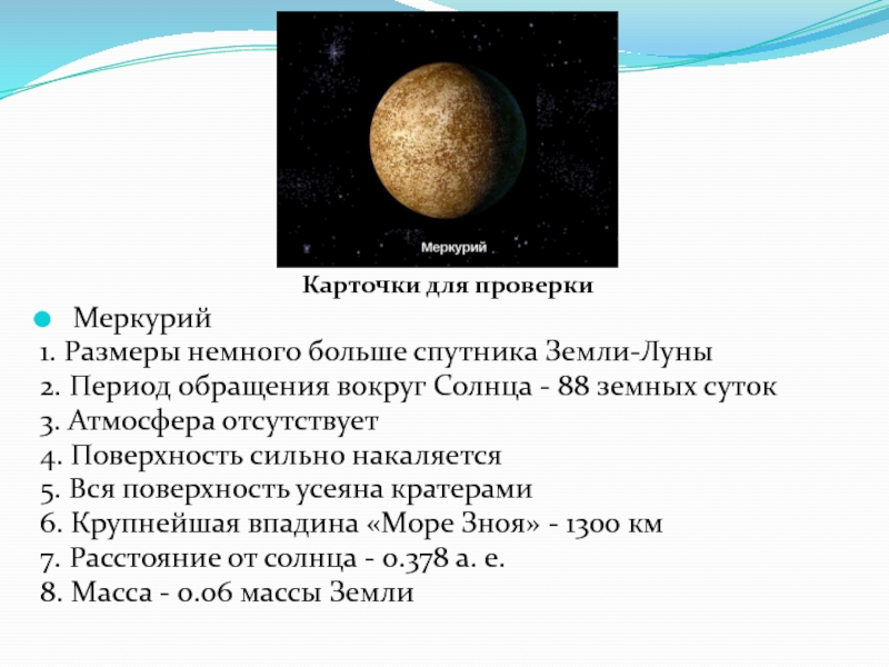 Карточки для проверки Меркурий1. Размеры немного больше спутника Земли-Луны2. Период обращения вокруг Солнца - 88 земных суток3.
